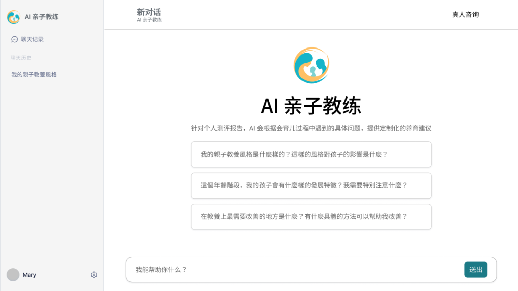 EW IMPACT 製作 晞禾智能親子教練 定製育兒,EWI 讓愛更貼心 追蹤最新消息 這個 AI 適合誰? 父母 從業者 企業 AI 提供哪些服務? 晞禾教養測評診斷 AI 驅動的個性化育兒專家 親子教練師媒合 晞禾行動方案執行助手 晞禾親子教練師培訓 晞禾智能親子教練提供哪些服務?豐富知識案例,搭配多維度評量,提供 AI 客製化育兒建議,無論身處何地,通過手機或電腦隨時隨地獲得育兒指導! 晞禾教養測評診斷透過專業測評問卷,幫助家長更全面地瞭解自己和孩子的特點,生成個性化的綜合報告,深入分析家庭教育的現狀和問題,提出針對性的改進建議。 了解更多 AI 驅動的個性化育兒專家針對個人測評報告,AI 會根據會育兒過程中遇到的具體問題,提供定制化的養育建議。 了解更多 親子教練師媒合晞禾提供線上一對一專業教練師諮詢,透過專業指導與溫暖陪伴,幫助家長找到最適合的親子成長之道。 了解更多 晞禾行動方案執行助手幫助制定個性化的行動改善計畫,讓教養不再只是理論,而是一步步可落實的具體行動。 了解更多 晞禾親子教練師培訓借助 AI 賦能,提供系統學習機會、引導技巧訓練、專業培訓與認證,幫助教養經驗豐富的父母和教育從業者邁向專業親子教練之路。 了解更多 晞禾智能親子教練的適合對象 家長精準定位適合自己家庭的教養方式,提供專屬育兒建議,消除育兒過程中的潛在負面影響,提供專業親子教練資源和案例,解決育兒的疑難雜症 了解更多 親子教練師AI 精準識別客戶需求,提供定制化育兒建議,降低時間成本並提升家庭教育信任度。平台結合一對一諮詢與親子活動,助力實踐與職業發展。 了解更多 企業組織作為員工福利,幫助職場父母解決親子教育難題,提升員工的工作投入度和幸福感,提升企業組織的社會責任感和品牌形象。 了解更多 關注最新消息 您的稱呼 Email 送出感谢您的订阅!您已成功提交邮箱,后续第一手消息将直接发送至您的邮箱。 在提交表单时出现了一些错误。请再次核对表单的所有字段。 AI 親子教練 | Powered by EW Impact Inc.